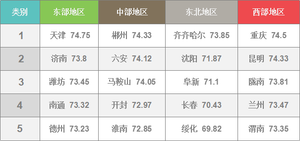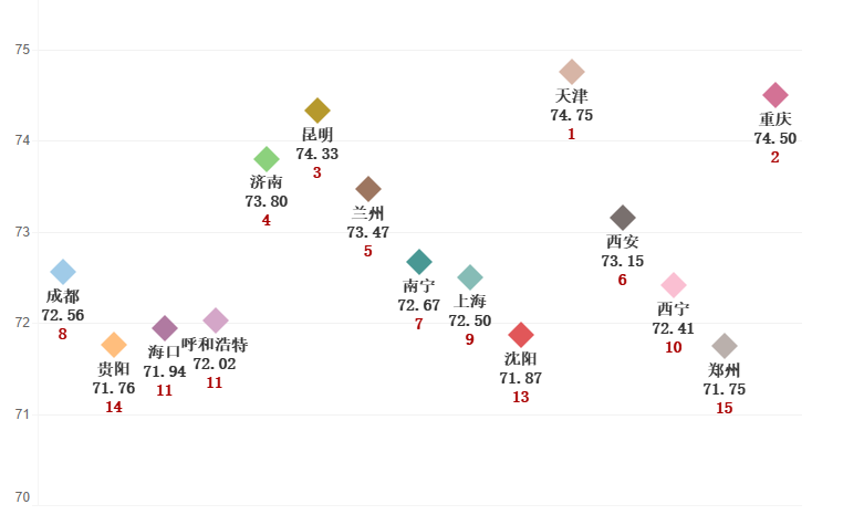 天津74.75,重慶74.5,濟南73.8,西安73.15,青島73.03,成都72.56,上海72.5,深圳72.19,沈陽71.87,杭州70.71,北京70.5,長春70.43,廣州69.36,寧波69.07,武漢69.02,哈爾濱68.48,大連67.34,南京66.81,廈門64.32。