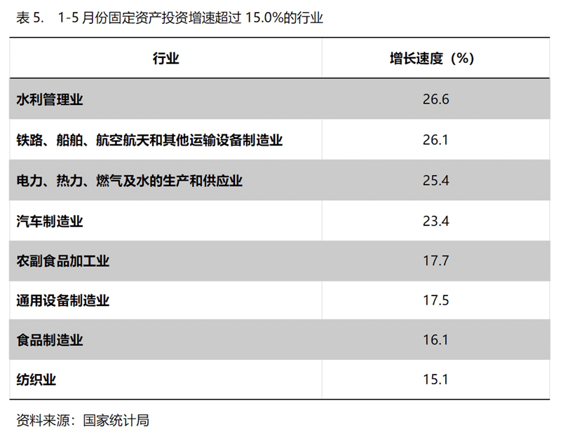 1-5月份,固定資產(chǎn)投資增速超過(guò)15%的主要行業(yè)共8個(gè),即水利管理業(yè)增長(zhǎng)26.6%,鐵路、船舶、航空航天和其他運(yùn)輸設(shè)備制造業(yè)增長(zhǎng)26.1%,電力、熱力、燃?xì)饧八纳a(chǎn)和供應(yīng)業(yè)增長(zhǎng)25.4%,汽車制造業(yè)增長(zhǎng)23.4%,農(nóng)副食品加工業(yè)增長(zhǎng)17.7%,通用設(shè)備制造業(yè)增長(zhǎng)17.5%,食品制造業(yè)增長(zhǎng)16.1%,紡織業(yè)增長(zhǎng)15.1%。