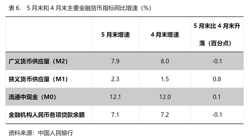 (六)M2增速由升轉(zhuǎn)落。5月末,廣義貨幣供應(yīng)量(M2)同比增長(zhǎng)7.9%,比4月末增長(zhǎng)8.0%回落0.1個(gè)百分點(diǎn),基本保持了上月末的增速;狹義貨幣供應(yīng)量(M1)增速比上月有所回升,5月末同比增長(zhǎng)2.3%,比4月末增長(zhǎng)1.5%回升0.8個(gè)百分點(diǎn),而4月末增幅比3月末增幅回落0.1個(gè)百分點(diǎn);流通中貨幣(M0)增速持續(xù)回升,5月末同比增長(zhǎng)12.1%,比4月末增長(zhǎng)12.0%回升0.1個(gè)百分點(diǎn),而4月末增速比3月末增速回升0.5個(gè)百分點(diǎn)。5月末M2增速與上月增速基本持平,M1和M0增速回升,表明貨幣政策仍在向適度寬松方向的要求運(yùn)行,但需要關(guān)注的還是M1增速仍還比較緩慢。