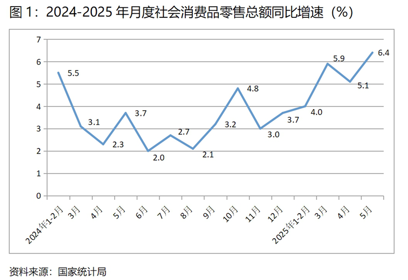(一)零售增速由落轉(zhuǎn)升。5月份,社會(huì)消費(fèi)品零售總額同比增長(zhǎng)6.4%,比4月份增長(zhǎng)5.1%回升了1.3個(gè)百分點(diǎn),4月份比3月份增長(zhǎng)5.8%回落了0.7個(gè)百分點(diǎn),社會(huì)消費(fèi)品零售總額增速由上月回落轉(zhuǎn)為回升,為上年以來(lái)月度同比增速最快的月份。這是近一個(gè)時(shí)期特別是今年以來(lái)持續(xù)采取以舊換新等一系列擴(kuò)大消費(fèi)政策措施的結(jié)果,同時(shí)也說(shuō)明只要采取積極有效的政策措施,是能夠取得一些領(lǐng)域持續(xù)回升的效果。