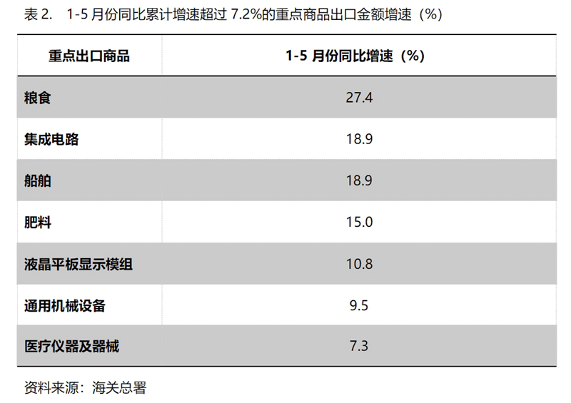 1-5月份,出口金額同比增速超過(guò)7.2%的重點(diǎn)商品共有7類,即糧食增長(zhǎng)27.4%,集成電路增長(zhǎng)18.9%,船舶增長(zhǎng)18.9%,肥料出口增長(zhǎng)15.0%,液晶平板顯示模組增長(zhǎng)10.8%,通用機(jī)器設(shè)備增長(zhǎng)9.5%,醫(yī)療儀器及器械增長(zhǎng)7.3%。