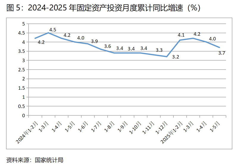 (五)投資增速持續(xù)回落。1-5月份,固定資產(chǎn)投資同比增長(zhǎng)3.7%,比1-4月份增長(zhǎng)4.0%回落了0.3個(gè)百分點(diǎn),1-4月份增速比1-3月份增長(zhǎng)4.2%回落了0.2個(gè)百分點(diǎn),增速呈現(xiàn)出持續(xù)的回落。1-5月份國(guó)有控股投資同比增速比1-4月份回落0.3個(gè)百分點(diǎn);民間投資回落了0.2個(gè)百分點(diǎn)。三次產(chǎn)業(yè)投資中,第一產(chǎn)業(yè)投資增速回落4.8個(gè)百分點(diǎn),第二產(chǎn)業(yè)投資增速回落0.3個(gè)百分點(diǎn),第三產(chǎn)業(yè)投資降幅擴(kuò)大0.2 百分點(diǎn)。民間投資和第三產(chǎn)業(yè)投資增長(zhǎng)仍比較緩慢。