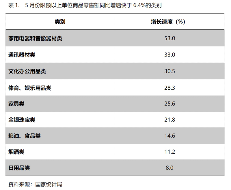 5月份,限額以上單位商品零售額增速快于社會(huì)消費(fèi)品零售總額6.4%增速的共有9類,即家用電器和音像器材類增長(zhǎng)53.0%,通訊器材類增長(zhǎng)33.0%,文化辦公用品類增長(zhǎng)30.5%,體育、娛樂(lè)用品類增長(zhǎng)28.3%,家具類增長(zhǎng)25.6%,金銀珠寶類增長(zhǎng)21.8%,糧油、食品類增長(zhǎng)14.6%,煙酒類增長(zhǎng)11.2%,日用品類增長(zhǎng)8.0%。