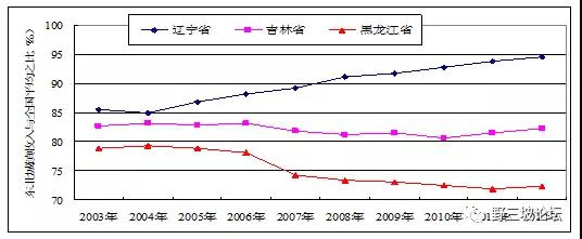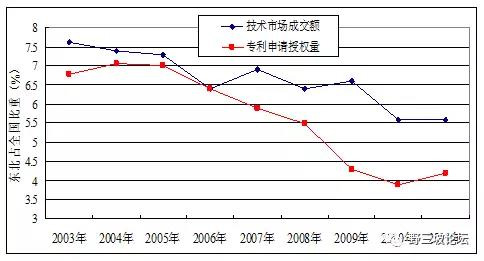 2011年,遼、吉、黑三省R&D經費支出分別占地區(qū)生產總值的1.52%、1.23%和1.02%,均低于全國1.84%的平均值,占全國比重由2003年的9.16%下降到2011年的7.1%。