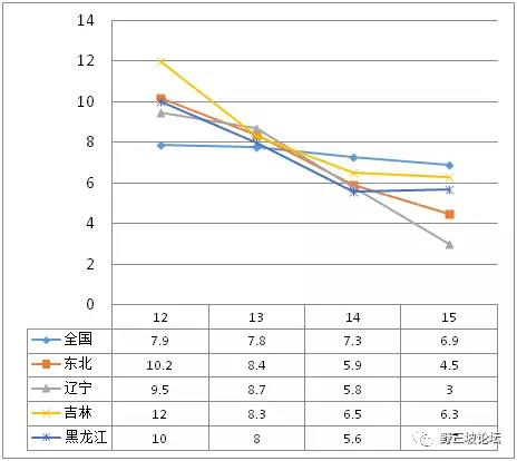 另外有一個數(shù)字,我希望經濟學家們進一步分析。近兩年東北居民消費水平增長率和東北的GDP下降是反向的。遼寧是“斷崖式”的GDP下降,但居民消費增長率2012年-2015年一直高于全國平均水平。
