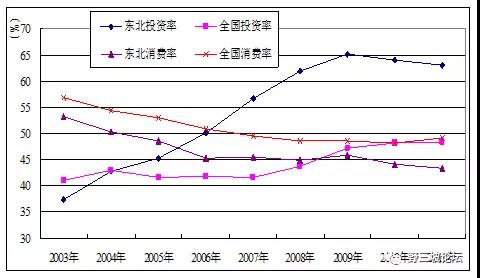 我們可以看看,從2003年到2012年這十年,實際上東北很多問題并沒有真正解決,比如投資率、消費率比嚴重扭曲,東北比全國要嚴重的多。三省投資率由2003年的37.3%上升至2011年的63.1%,提高了25.8個百分點,而同期全國由41%增長到48.3%,提高了7.3個百分點;消費率由53.2%下降至43.2%,降低10個百分點,而同期全國由56.9%下降至49.1%,降低7.8個百分點。全國的投資率已經過高了,東北的投資消費比例更加扭曲。